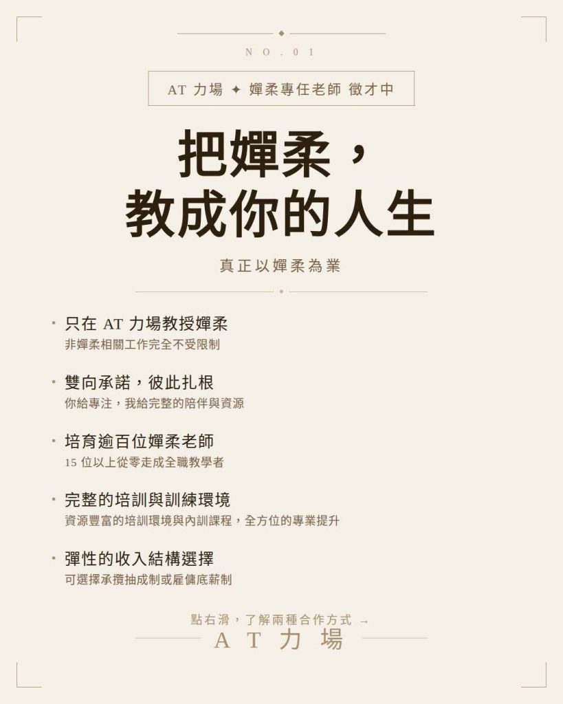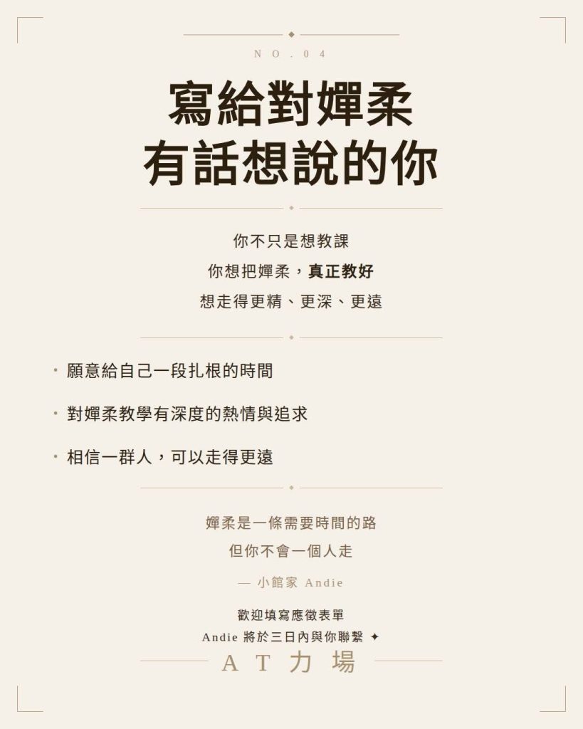 正因如此,AT 力場在 2019 年成立,目標就是打造一個能讓嬋柔老師「扎根、成長、以此為業」的環境。